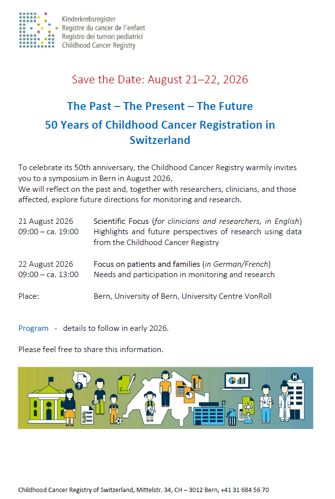 https://www.childhoodcancerregistry.ch/wp-content/uploads/sites/5/2025/10/Banner-Bevolk-Info-scaled-e1760427312531.jpg5331033gvautravershttps://www.childhoodcancerregistry.ch/wp-content/uploads/sites/5/2019/10/kikr-logo.svggvautravers2025-10-14 08:58:572025-10-14 08:58:58Save the Date: August 21–22, 2026 – 50 Years of Childhood Cancer Registration in Switzerland